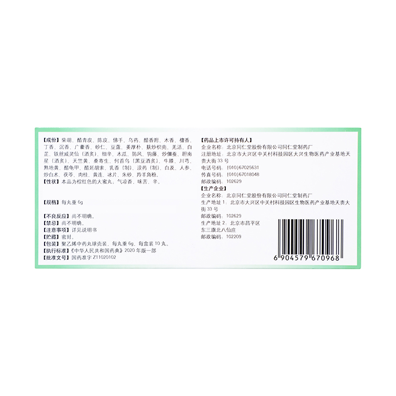 同仁堂 平肝舒络丸 6g*10丸/盒
